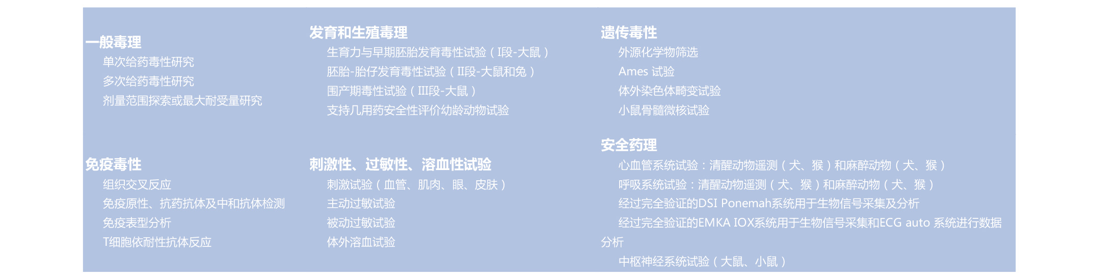 遵循國內(nèi)GLP管理規(guī)范及國外相關(guān)法規(guī)要求,根據(jù)CFDA及參照ICH藥品非臨床研究相關(guān)技術(shù)指導(dǎo)原則,提供嚙齒類、非嚙齒類和非人靈長類不同種屬動(dòng)物的藥物安全性評(píng)價(jià)研究