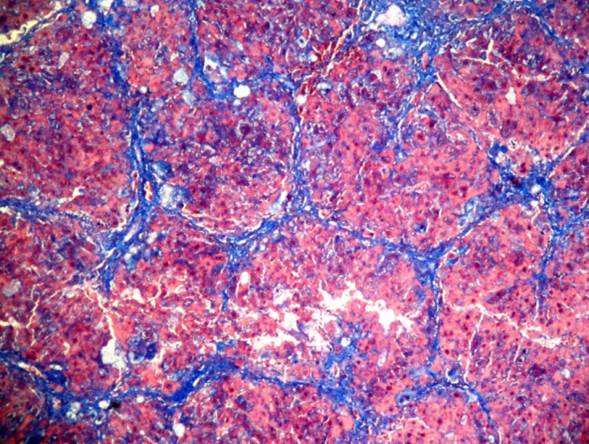 4.磷鉬酸水溶液對麗春紅、酸性復紅有分化作用,分化時鏡下控制, 肌纖維和纖維素呈紅色,膠原纖維呈淡粉紅色即可。