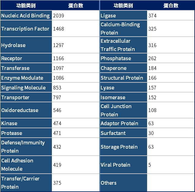 20K人類蛋白組芯片通過(guò)化學(xué)修飾共價(jià)結(jié)合19275種人類蛋白質(zhì)和119種小鼠蛋白質(zhì)。這些蛋白廣泛覆蓋受體、轉(zhuǎn)錄因子、激酶、胞外基質(zhì)蛋白、細(xì)胞骨架蛋白等30余種蛋白類型,可用于多種生物學(xué)功能的創(chuàng)新研究。
