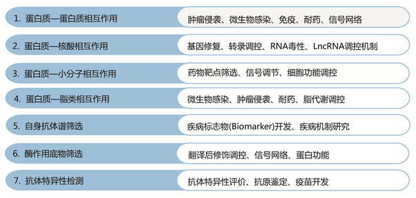 20K人類蛋白組芯片適用于以蛋白質(zhì)相互作用為基礎(chǔ)原理的各種研究領(lǐng)域,具備廣泛的應(yīng)用價(jià)值。在蛋白與蛋白相互作用篩選、蛋白與核酸相互作用鑒定方面相比傳統(tǒng)的Co-IP聯(lián)合質(zhì)譜鑒定的技術(shù)路線,更加高效和準(zhǔn)確。在小分子藥靶鑒定、單克隆抗體特異性篩選、脂類結(jié)合蛋白篩選、酶作用底物鑒定及自身抗體類biomarker的篩選等應(yīng)用中,其技術(shù)優(yōu)勢(shì)不可替代。
