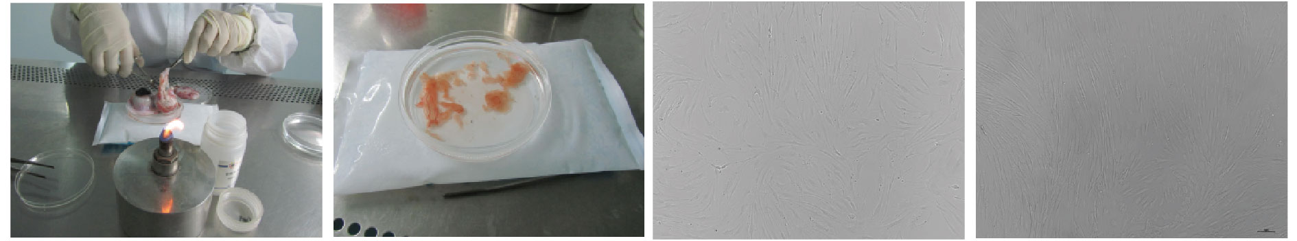 (3)每次消化后取上清液,并加入等量的含10%的DMEM培養(yǎng)基,輕輕混勻,中和胰酶的消化,防止消化過度。用200目細(xì)胞過濾篩子過濾含細(xì)胞的混合液,最后將過濾后的細(xì)胞懸液1000rpm離心5min。離心后收集沉淀,用PBS再次重復(fù)離心3次。用細(xì)胞培養(yǎng)基將細(xì)胞沉淀重懸,接種于細(xì)胞培養(yǎng)瓶中培養(yǎng),并每日觀察細(xì)胞的生長,接種后約4d后有少量細(xì)胞貼壁。